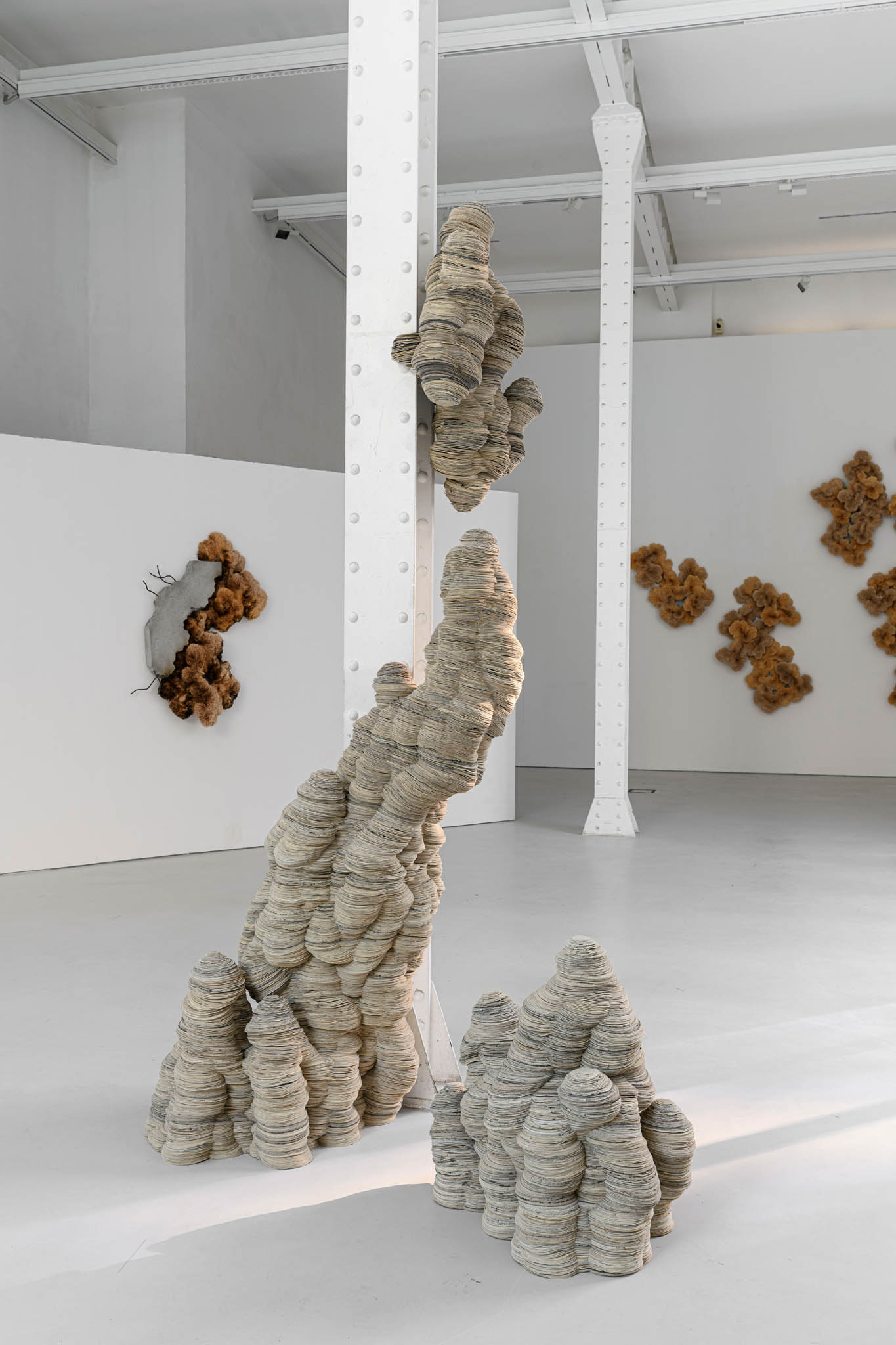 The exhibition invites the viewer into Chris Soal’s creative process, which unfolds through the concept of spillover—a term that describes the phenomenon of “overflowing.” The materials overflow, surpassing their original function and becoming something else. Perception overflows, called to transcend categories and boundaries. The imagination overflows, shifting from the inorganic toward the biological, evoking proliferating cellular forms, geological layers accumulated over time, and organisms multiplying through space.