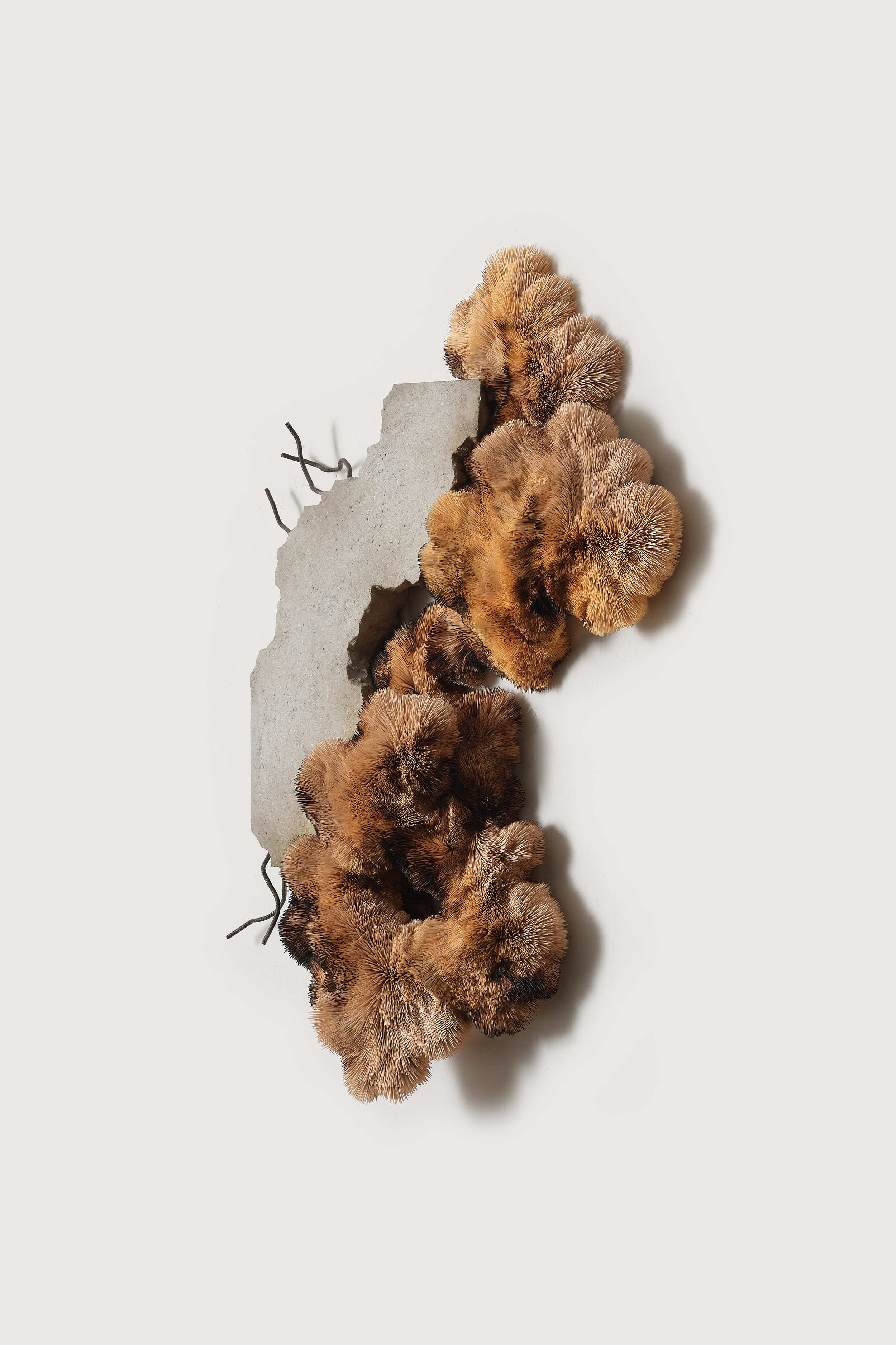 Toothpicks, beer bottle caps, concrete, and sandpaper become, in Chris Soal’s hands, visual organisms that transcend their original function, evoking cellular proliferations, geological stratifications, and new architectures of the living. Each of the artist’s works results from an act of accumulation and layering, through which matter generates new possibilities of itself, transforming into unexpected entities along the thread of a research and poetics that go beyond mere reuse. His practice moves toward a reflection on biological transformation and the interconnection of systems, staging a perceptual ecology that concerns life itself.